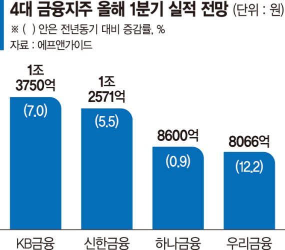 3일 금융정보업체 에프엔가이드와 증권업계에 따르면 KB금융, 신한금융, 하나금융, 우리금융의 올해 1·4분기 순이익은 4조 3000억원에 육박할 것으로 전망됐다. 이는 1년 전보다 8%가량 늘어난 수치다.