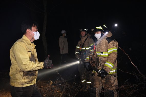 이날 현장에 투입된 공무원은 500여명으로, 밤 9시 30분부터 순차적으로 현장에 투입된 이들은 야간 투입이 어려운 산불진화헬기 대신 직접 갈고리와 등짐펌프를 매고 산에 올라 확산 저지에 힘을 보탰다.