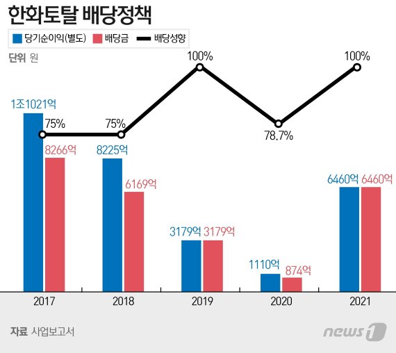 한화토탈에너지스는 실적과 무관하게 70% 이상의 고배당 정책을 유지해왔다. 2019년에는 당기순이익 3179억원을 고스란히 배당했다. 1110억원의 당기순이익을 낸 2020년의 배당성향도 78.7%(874억원)였다.