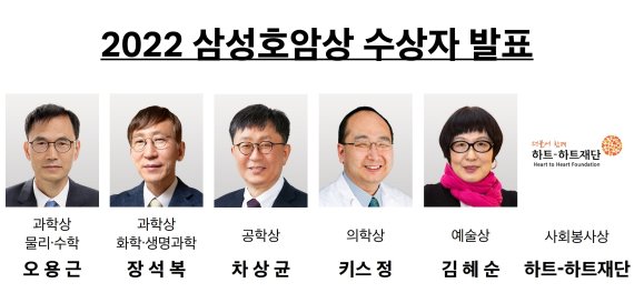 6일 호암재단에 따르면 올해 수상자는 ▲과학상 물리·수학부문 오용근(61) 포스텍 교수 ▲화학·생명과학부문 장석복(60) 카이스트 특훈교수 ▲공학상 차상균(64) 서울대 교수 ▲의학상 키스 정(57) 美 하버드의대 교수 ▲예술상 김혜순(67) 시인 ▲사회봉사상 하트-하트재단 등 개인 5명, 단체 1개다.