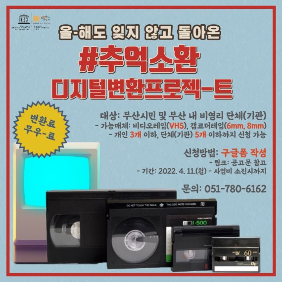 이 프로젝트는 재생하기 어려운 추억의 영상을 디지털 파일로 변환해 컴퓨터나 스마트폰 등을 통해 손쉽게 만나 볼 수 있도록 지원하는 사업으로 부산시의 유네스코 영화 창의도시 지정을 시민과 함께 기념하고자 하는 취지에서 마련됐다.