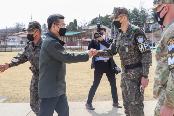 (서울=뉴스1) 노민호 기자 = 서욱 국방부 장관이 지난주 판문점 공동경비구역(JSA) 경비대대 '캠프 보니파스'를 방문해 장병들을 격려했다고 10일 주한유엔군사령부가 밝혔다.