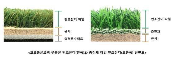 현재 국내시장에 보급된 대부분의 인조잔디는 잔디파일과 잔디파일을 지탱하는 규사층, 충격흡수 용도인 충진재층으로 구성돼 있다.
