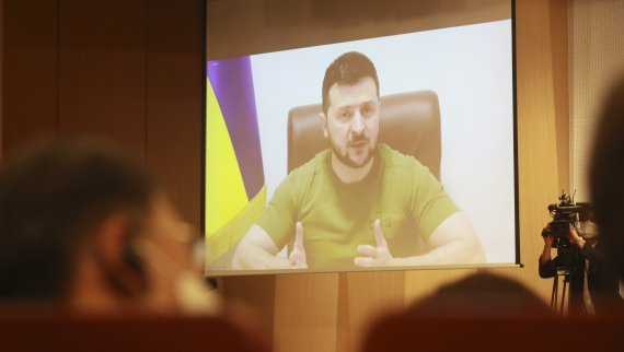 [서울=뉴시스] 최진석 기자 = 볼로디미르 젤렌스키 우크라이나 대통령이 11일 오후 서울 여의도 국회 도서관 대강당에서 화상연설을 하고 있다. (공동취재사진) 2022.04.11. photo@newsis.com [서울=뉴시스] 박대로 기자 = 볼로디미르 젤렌스키 우크라이나 대통령이 한국 정부에 러시아의 탱크, 배, 러시아 미사일을 막을 수 있는 군사 장비를 달라고 요청했다. 그러나 한국 국방부는 13일 방탄조끼, 방탄판, 전투 식량, 마취기, 야전용 지혈대, 항생제 등 비살상용 군수 물자를 보내겠다고 발표, 젤렌스키 대통령의 요청을 사실상 거절했다.