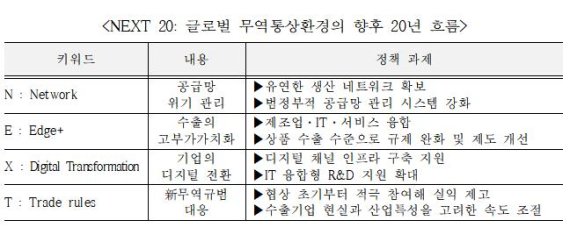 한국무역협회 국제무역통상연구원은 13일 내놓은 '글로벌 무역통상 환경 변화와 대응 과제: NEXT 20' 보고서를 통해 코로나19 이후 중장기 글로벌 무역통상 환경 변화에 대응하기 위한 4대 선결과제에 대해 이같이 밝혔다.