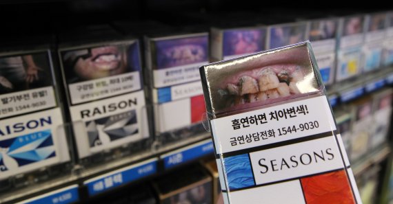 [서울=뉴시스] 조성우 기자 = 보건복지부가 담뱃갑에 새롭게 표기할 흡연 경고그림 및 문구를 바꾸기로 했다고 13일 밝혔다. 새로 선정된 경고그림은 건강 위험에 대한 표현을 주제별 특성에 맞게 강화했고, 경고문구도 흡연으로 발생할 수 있는 질병 및 건강위험을 명확하고 간결하게 강조했다. 13일 오후 서울 시내 한 편의점에 흡연 경고그림이 그려진 담배가 진열돼 있다. 2022.04.13. xconfind@newsis.com [서울=뉴시스] 류현주 기자 = 보건복지부가 담뱃갑에 새롭게 표기할 제4기 경고그림 및 문구 12개를 확정했다고 13일 밝혔다.