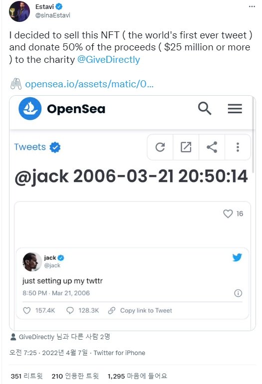 앞서 지난해 3월 6일 잭 도시는 2006년 3월 22일 자신이 작성한 세계 첫 트윗을 NFT형식으로 트윗 장터인 '밸류어블스'에 경매로 올렸다. 이를 2주 뒤인 시나 에스타비가 낙찰받고 1639.58이더(ETH)를 지불했다. 당시 가치로 290만달러이며 우리나라 돈으로 33억원에 육박했다.