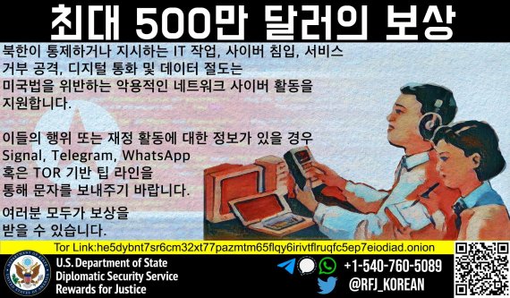 미 국무부가 운영하는 테러 정보 신고·포상 프로그램인 '정의에 대한 보상'(Rewards for Justice)은 15일(현지시간) 트위터와 페이스북 등에 "북한의 대량살상무기(WMD)와 탄도미사일 프로그램에 기여하는 자금을 창출하는 정보기술(IT) 요원들의 악의적인 활동에 관한 정보에 최대 500만 달러를 지급한다"라고 공지했다.