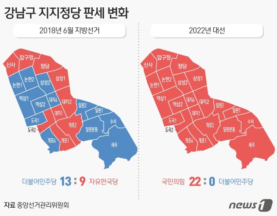 또 올해 3월 대선에선 윤석열 대통령 당선인이 강남구 내 22개 동 전체에서 승리했다.