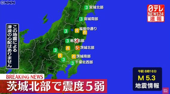 [서울=뉴시스] 김예진 기자 = 19일 오전 8시 16분께 일본 후쿠시마(福島)현과 이바라키(茨城)현 북부 경계 부근에서 규모 5.3으로 추정되는 지진이 발생했다.