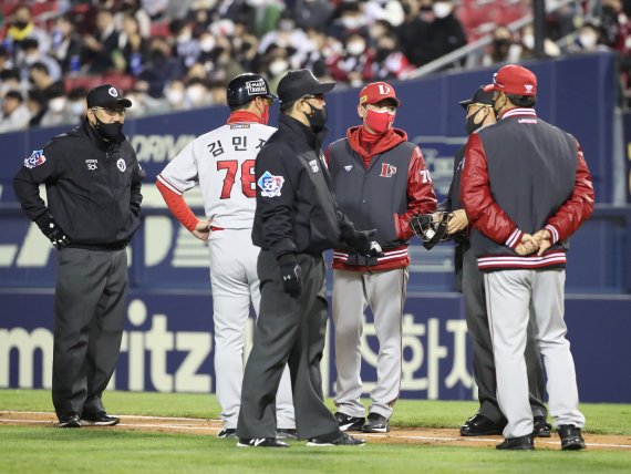 내야 타구 페어·파울 여부는 비디오 판독 대상이 아니라서 심판진은 김 감독의 항의를 받아들이지 않았다.