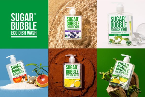 신규 출시된 제품은 슈가버블 친환경 주방세제 △레몬 크러쉬 △블루베리 드롭 △허브 메들리 △트로피칼 펀치 △시트러스 가든 △마일드 그레인 6종으로, 470mL, 940mL 용기 제품과 1.2L 리필 제품, 대용량 2.5L 제품으로 출시됐다.
