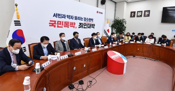 이준석 국민의힘 대표는 이날 국회에서 열린 당 대표·중진 의원 연석회의에서 "결국 이들(민주당)이 그토록 바라는 것이 검찰을 사실상 소멸시키는 것이었다면 애초 지난 문재인 정권 내내 왜 개혁을 하겠다고 난리 쳤냐"고 비판했다.