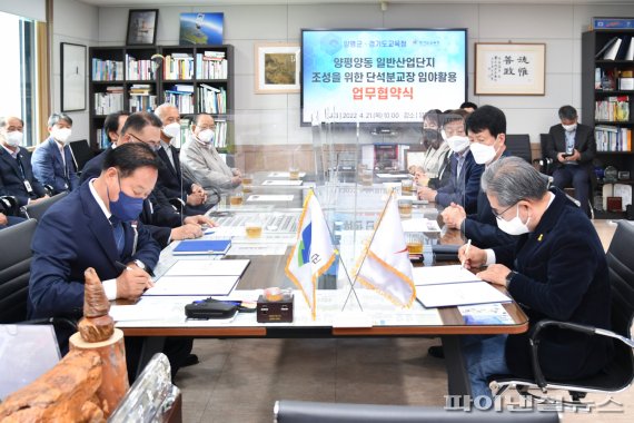 【파이낸셜뉴스 양평=강근주 기자】 양평군과 경기도교육청은 양동면 쌍학리의 ‘양동 일반산업단지’ 조성을 위한 단석분교장 임야 활용에 대한 업무협약을 21일 체결했다.