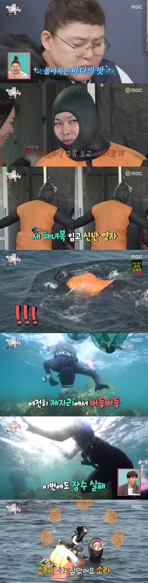 이영자는 홍진경을 불러 "미친 거 아니냐"고 물었다. 홍진경은 이영자가 너무 지쳐있다며, 해녀 체험으로 힐링이 필요하다고 했다. 결국 이영자는 해녀복을 갈아입고 나왔다. 이영자는 "옷 입는 데만 40분이 걸렸다"고 말했다. 이영자는 유튜브 PD를 째려보겠다고 말했지만, 기분이 좋아진 듯 춤을 췄다. 이영자는 겁 없이 바다에 들어갔다. 예상 밖의 수영 실력을 자랑했다. 알고 보니 스킨스쿠버 자격증도 있었다. 반면 홍진경은 가벼운 몸무게 탓에 잠수부터 난항이었다. 도움을 받아 바다를 구경했다. 이영자는 뿔소라를 따고 좋아했다. 이영자는 "저 밑에 전복이 있으면 30m라도 가겠더라"고 말했다. 이영자 때문에 자극받은 홍진경도 분발했다.