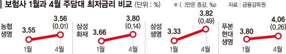 1월 가장 낮은 금리를 제시했던 삼성생명은 3.33%에서 4월 3.82%로 0.49%p 올렸다. 한화생명은 3.90%에서 0.36%p, 현대해상은 지난 1월 3.66%에서 0.43%p, 농협손보는 3.66%에서 0.65%p로 각각 기준금리보다 높게 인상했다. 1월 주담대 대출 금리가 다소 높았던 교보생명만 4.61%에서 0.27%p 내렸다.