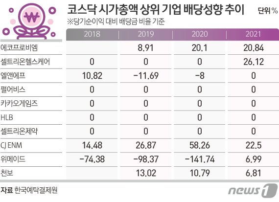 24일 한국거래소에 따르면 코스닥 시가총액 상위 10개 기업(21일 기준) 중 2021년 사업연도에 대한 배당금을 지급한 기업은 5곳으로 집계됐다. 절반은 배당을 하지 않은 셈이다.