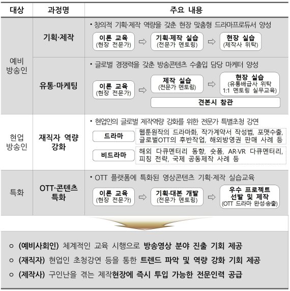 함께 진행되는 '재직자 역량 강화 과정'과 올해부터 신설된 '온라인동영상서비스(OTT) 콘텐츠 특화 과정'에 대한 더욱 자세한 사항은 방송영상인재교육원 누리집에서 확인할 수 있다.