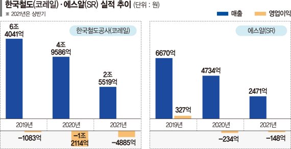 이런 가운데 두 공기업 모두 코로나19로 이용객이 감소해 적자 문제를 안고 있다. 코레일은 2020년 1조2114억원의 적자를 기록한 데 이어, 지난해 상반기에도 4885억원의 손실이 이어졌다. SR도 2020년 234억원, 지난해 상반기 148억원의 적자를 봤다.