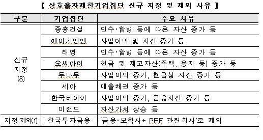 공시대상기업집단에는 두나무, 크래프톤, 보성, KG, 일진, 오케이금융그룹, 신영, 농심이 신규로 지정됐다. IMM인베스트먼트, 한국투자금융, 대우건설은 제외됐다. 상호출자제한 기업집단에는 중흥건설, HMM, OCI, 두나무, 세아, 한국타이어, 이랜드가 신규로 진입했다. 한국투자금융은 제외됐다. 한국투자금융 등의 제외는 공정거래법 시행령 개정으로 사모펀드(PEF) 전업집단 등은 올해부터 제외된 데 따른 것이라고 공정위는 밝혔다.