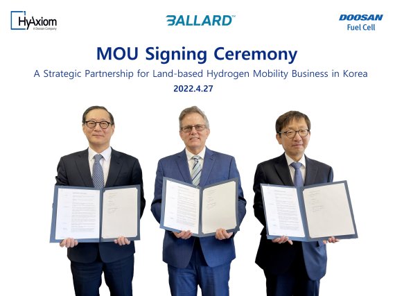 두산퓨얼셀은 미국 코네티컷에 위치한 하이엑시엄(HyAxiom) 본사에서 발라드파워시스템즈(Ballard Power Systems, 이하 발라드), 하이엑시엄과 모빌리티용 수소연료전지 시스템 개발, 수소버스 보급 사업을 위한 업무협약(MOU)을 체결했다고 28일 밝혔다.