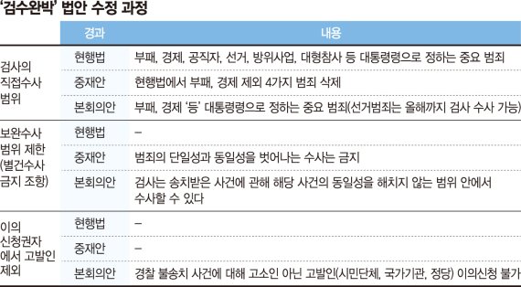 검찰청법 개정안은 검찰의 직접 수사 대상 범죄를 기존 6대 범죄(부패, 경제, 공직자, 선거, 방위사업, 대형참사)에서 부패·경제 범죄로 축소하는 내용이다. 개정안의 취지는 장기적으로 검찰은 기소만, 경찰은 수사만 이라는 수사권과 기소권의 분리다.