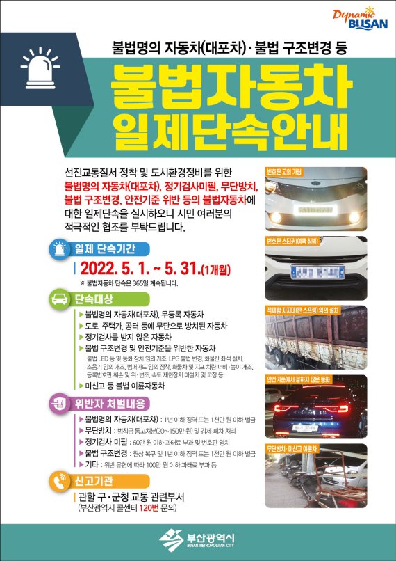 (부산=뉴스1) 백창훈 기자 = 부산 동래구는 5월 한 달간 유관 기관과 함께 불법 자동차 일제단속을 실시한다고 2일 밝혔다.