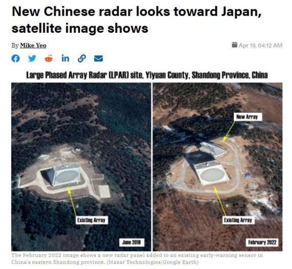 앞서 미국 군사 전문매체 디펜스뉴스는 중국 산둥성 이위안현의 산 정상(해발 약 700미터)에 새로운 대형 위상배열레이더(LPAR)가 설치된 모습이 2월 촬영한 위성사진에 포착됐다고 보도했다.