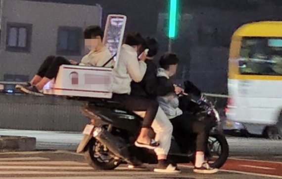 제일 앞자리에는 오토바이의 운전자가 탑승했으며, 그 뒤로는 슬리퍼를 신은 두 명이 앉았다.