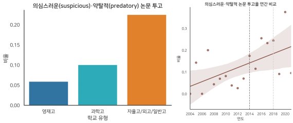 이 같이 고등학생의 논문이 부실학회·학술지에 게재되는 경우는 자율고(자율형사립고, 자율형공립고)·외고·일반고에 특히 많았다. 이들 학교에 재학 중인 고등학생이 쓴 논문 가운데 22.4%가 부실학회·학술지에 실렸다. 과학고는 10%, 영재고는 5.9% 순이었다.