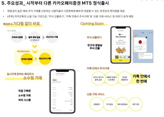 이지홍 카카오페이 서비스 총괄 리더는 2일 1분기 실적 발표 콘퍼런스콜에서 "카카오페이증권 MTS는 지난달 25일부터 공격적인 프로모션을 시작하며 서비스를 본격화했다"며 "해외 주식 거래시 달러 환전 없이 바로 거래하고, 카카오페이가 직접 구축한 소수점거래 처리 시스템으로 소수점 거래가 실시간으로 가능해졌다"고 설명했다.