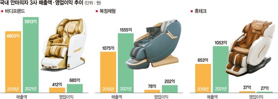 업계 3위 휴테크의 매출액 역시 2019년 653억원에서 2020년 848억원, 2021년 1053억원으로 크게 늘어났다. 매출이 1000억원을 넘어선 것은 지난해가 처음이다. 영업이익은 2019년 37억원에서 2020년 116억원으로 증가했지만, 지난해 27억원에 그쳐 전년 대비 77% 감소했다. 매출 증가이후 연구개발비와 마케팅 비용을 대폭 늘린 영향이 컸다. 실제 휴테크의 연구개발비와 판촉비는 2020년 106억원에서 지난해 174억원으로 1년 만에 약 70억원이 늘었다. 안마의자 업계의 고속성장의 주된 배경으로 코로나19가 꼽힌다. 집에 있는 시간이 길어지면서 안마의자에 대한 수요가 늘었고, 건강에 대한 관심이 늘면서 헬스케어 가전에 대한 관심이 증가했기 때문이다. 실제 업계에 따르면 2015년 3500억원이었던 국내 안마의자 시장 규모는 6년 새 3배 가까이 증가해 지난해 1조원을 돌파했다.