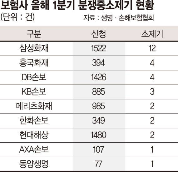 특히 지난해 4건이었던 소제기 건수도 1건에 불과했다. 손보사의 경우 지난해 1·4분기 소제기 신청건은 6285건에서 7850건으로 1565건(24.9%) 증가했지만 소제기 건수는 전년 20건에서 30건으로 소폭 증가했다.