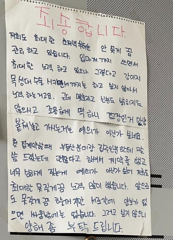 아랫집 주민이 층견소음을 견디다 못해 A씨의 현관문에 주의해달라는 취지의 메시지를 붙이자, A씨가 이에 대응하고자 안내문을 써 붙인 것으로 보인다.