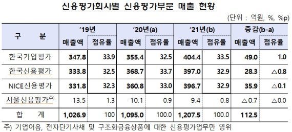 4일 금융감독원이 발표한 ‘2021년도 신용평가실적 분석 및 시사점’에 따르면 국내 신용평가사 4곳(한국기업평가, 한국신용평가, 나이스신용평가, 서울신용평가)의 신용평가부문 매출은 1207억5000만원으로 집계됐다. 이는 전년(1095억원) 대비 10.3%(112억5000만원) 증가한 규모다.