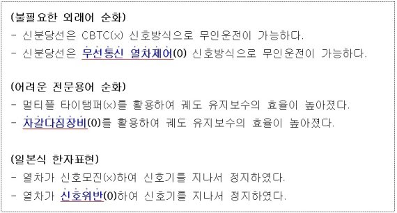 (서울=뉴스1) 금준혁 기자 = 국토교통부는 철도 분야에서 관행적으로 쓰여 온 불필요한 외래어나 전문용어를 국민이 쉽게 이해할 수 있도록 순화하고 행정규칙으로 고시할 계획이라고 4일 밝혔다.