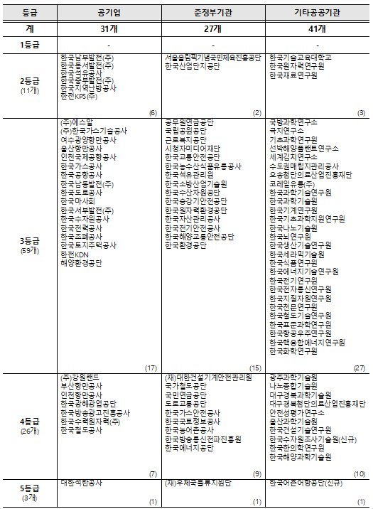 광주과학기술원·나노종합기술원·대구경북과학기술원·대구경북첨단의료산업진흥재단·안전성평가연구소·울산과학기술원·한국건설기술연구원·한국수자원조사기술원·한국한의학연구원·한국해양과학기술원 등 기타공공기관도 4등급에 이름을 올렸다.