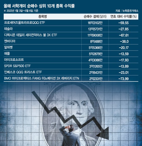8일 한국예탁결제원 증권정보포털 세이브로에 따르면 올해(2022년 1월 3일~5월 6일) 서학개미들이 순매수한 해외주식 상위 10개 종목이 모두 두자릿수 손실률을 기록했다. 특히 미국 3배 레버리지 상품이 3종목이나 포함됐으며 손실률은 60~70%대에 달했다.