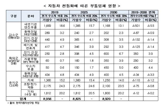 특히 내연기관 중심 부품기업은 지속적으로 감소해 2019년에 1668곳에서 2030년이 되면 1168곳으로 501곳이 감소할 것이라는 관측이다.