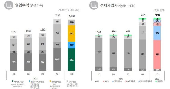 결합상품의 효과는 통신서비스 사업에만 그치지 않았다. TV 수신료·셋톱박스·임대료 등 서비스 매출은 991억원으로 전년 동기 대비 28% 증가했다. 스카이라이프와 HCN의 광고·홈쇼핑 송출 임대 수익이 집계된 플랫폼 부문도 수혜를 입었다. 이 사업의 매출은 2258억원으로 지난해 같은 기간보다 45% 늘었다.