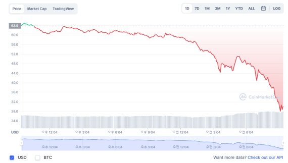10일 오전 9시 30분 코인마켓캡 기준 루나 가격은 전날 같은 시간보다 무려 50% 가량 하락한 30.38달러다. ANC 가격은 0.8달러로 전날 같은 시간보다 49.73% 급락했다.