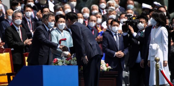 (서울=뉴스1) 박기범 기자 = 윤석열 대통령과 부인 김건희 여사는 10일 국회의사당 앞 잔디마당에서 열린 취임식 본 행사에서 앞서 참석한 문재인 전 대통령 내외와 박근혜 전 대통령과 악수하며 인사했다.