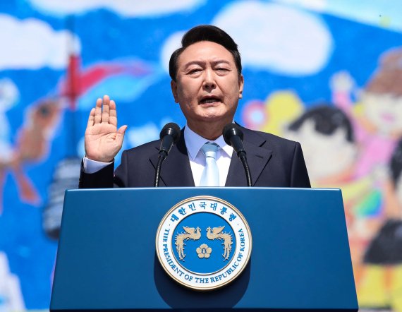 윤 대통령은 10일 국회 앞마당에서 열리고 있는 '제 20대 대통령 취임식'에 옅은 하늘색 넥타이에 곤색 정장을 착용한 모습으로 등장했다.