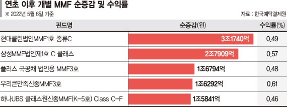 개별 펀드별로 '현대클린법인MMF1호 종류C'에 가장 많은 3조1740억원이 몰렸고 삼성MMF법인제1호 C 클래스(2조7909억원), 플러스 국공채 법인용 MMF3호(1조6794억원), 우리큰만족신종MMF3호(1조6292억원), 하나UBS 클래스원신종MMF(K-5호) Class C-F(1조5841억원) 등이 뒤를 이었다.