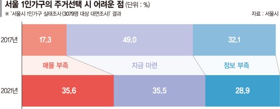 주거 관련해서는 1인가구 10명 중 7명이 '주택매물 부족(35.6%)'과 '주거지 비용 마련의 어려움(35.5%)'을 경험한 것으로 확인됐다. 더불어 54.1%가 '주거비 부담이 있다'고 응답했다. 임차 거주 가구의 30.9%는 월소득 대비 월 주거비가 20~30%를 초과하는 것으로 조사됐다.