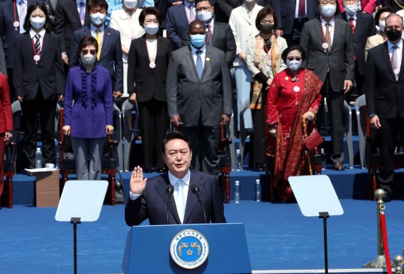 한편 윤 대통령은 이날 국회 앞마당에서 열린 취임식에서 “자유, 인권, 공정, 연대의 가치를 기반으로 국민이 진정한 주인인 나라, 국제사회에서 책임을 다하고 존경받는 나라를 위대한 국민 여러분과 함께 반드시 만들어 나가겠다"고 밝혔다.