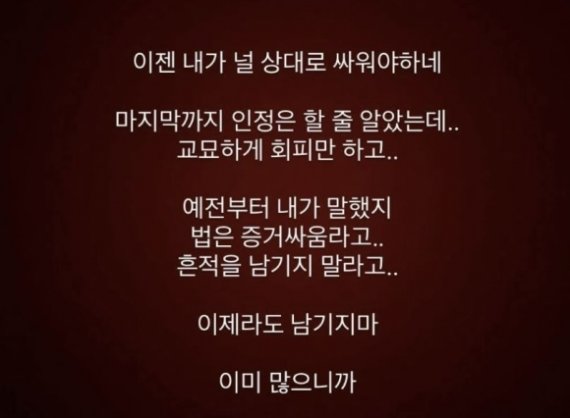 서주원은 11일 자신의 SNS을 통해 "이젠 내가 널 상대로 싸워야 하네 마지막까지 인정은 할 줄 알았는데"라며 "교묘하게 회피만 하고. 예전부터 내가 말했지. 법은 증거 싸움이라고. 흔적을 남기지 말라고. 이제라도 남기지 마. 이미 많으니까"라는 게시글을 게재했다.