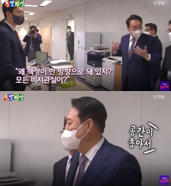 이에 "공간이 좁아서"라는 설명이 나왔고, 윤 대통령은 "아 그렇구나. 그래 조금 불편해도 나중에 다 옮길 거 아니에요"라고 반응했다.