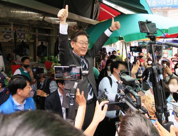 [인천=뉴시스] 김동영 기자 = 제8회 전국동시지방선거 인천 계양을에 출마한 더불어민주당 이재명 후보 겸 총괄선거대책위원장이 13일 오후 인천시 부평구 부평종합시장에서 시민들과 인사하며 지지를 호소하고 있다. 2022.5.13. dy0121@newsis.com [서울=뉴시스] 류현주 기자 = 제8회 전국동시지방선거 인천 계양을에 출마한 더불어민주당 이재명 후보 겸 총괄선거대책위원장이 13일 부평종합시장을 찾아 시민들에 지지를 호소했다.