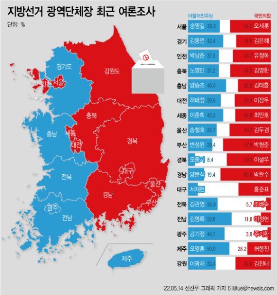 13일까지 발표된 광역단체장 여론조사를 종합하면 국민의힘은 서울과 인천, 강원, 충북, 울산, 부산, 경북, 경남, 대구 등 9곳에서 우세를 기록하고 있다.